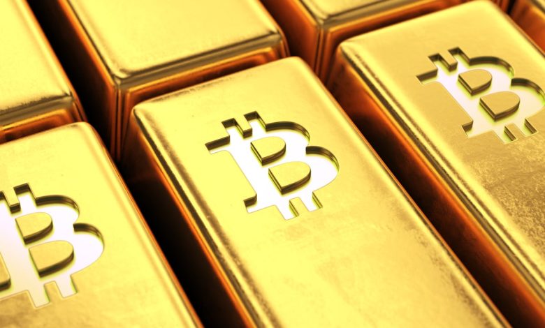 Bars of gold embossed with the Bitcoin logo.